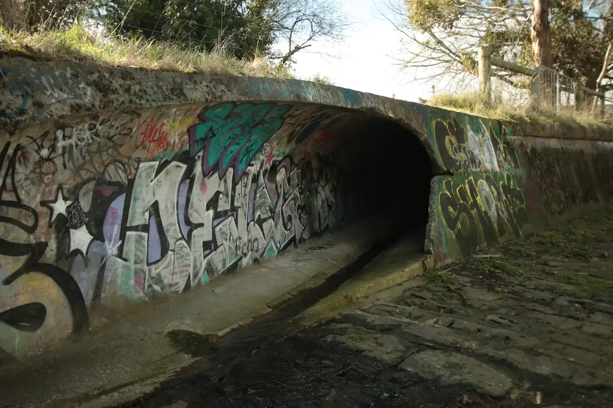There is a small section of RCP with a wooden board attatched to the end, makes for a good spot to tag. From here onwards the drain turns back into the canal before heading to a tiny crawl. A few metres into the crawl are some side holes where you can crawl straight out onto the road.