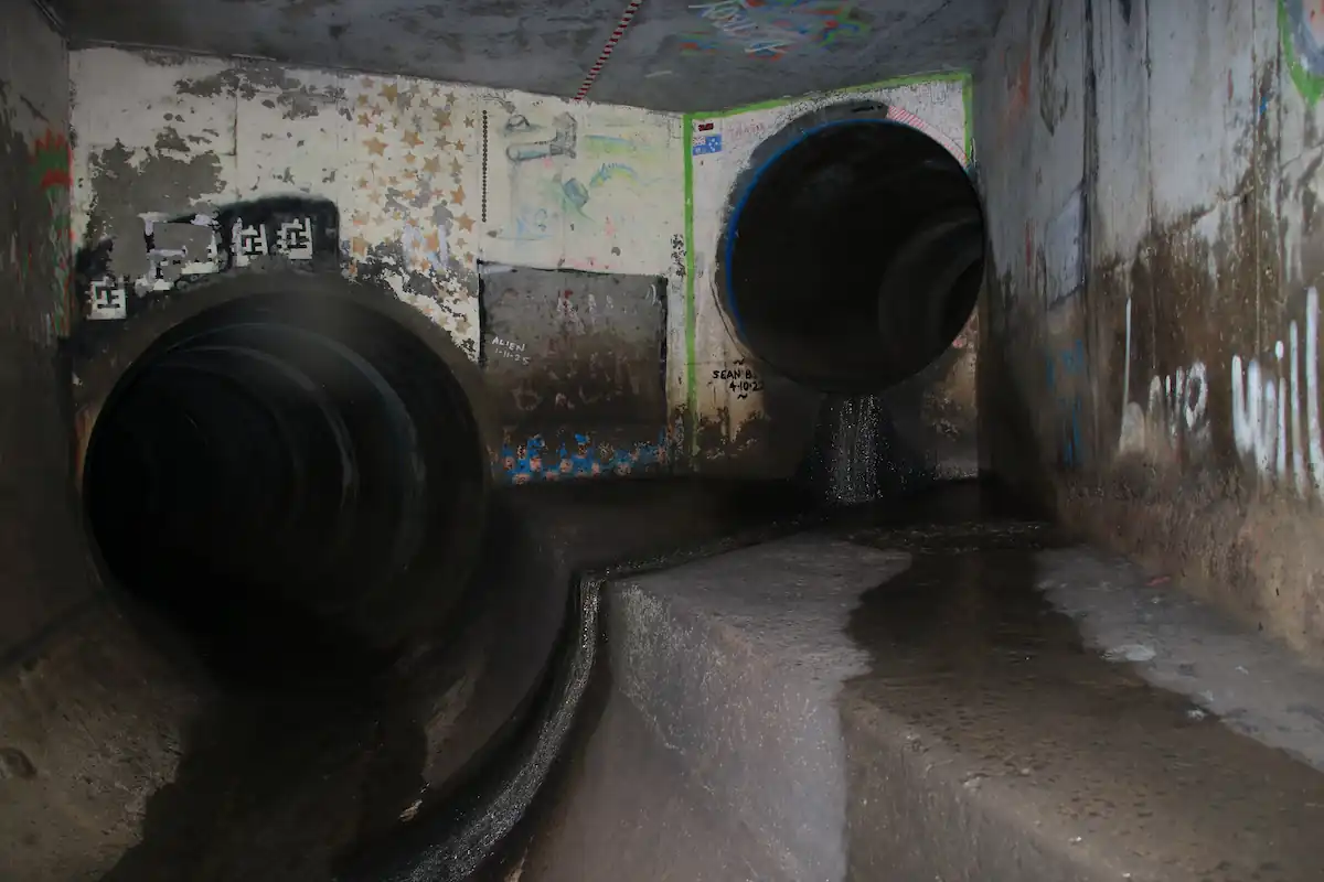 Around the dry entrance all the way up to the end the pipe is filled with a very thick mist coming from the lake overflow. The waterfalling here can make for some really cool photos, although flash photography is near impossible because of the mist.